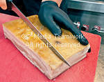 在蒸好的五花腩上放重物,压30分鐘定型后切丁方。煮滚油,炸香薑片、乾?头及?段。 |