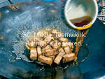 另起油鑊,下五花腩炒至表面金黄色,注入黄酒、蠔油、生抽及老抽炒匀。 |
