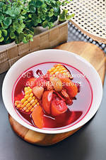 | 1.紅菜頭、紅蘿蔔去皮及切件,粟米切件,番茄去蒂及切件。鍋中加入材料。 |