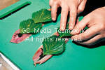 | 加大葉及青椒仔,由魚尾開始捲起魚肉,用牙籤固定成魚卷。 |