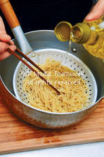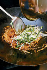| 原鑊加麵條,加豉油王汁料炒至乾身,加銀芽及韭菜炒勻,灑上芝麻。 |