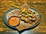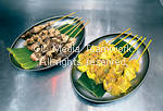 | 用长竹籤分别串上鸡髀肉与猪腩肉,每边烧4分鐘上碟,佐沙嗲酱吃。 |