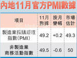 國家統計局公布,內地11月製造業採購經理指數(PMI)為49.2,較前月上升0.2個百分點,惟低於市場預期的49.3,並連續8個月處於收縮區間。