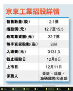 「京东系」将再添一间香港上市公司,工业供应链技术与服务提供商京东工业(7618)昨日开始招股,集资最多32.7亿元,传国际配售已足额认购,而香港公开发售的孖展暂超购3.8倍。「顶头槌飞」未能稳中一手的乐摩科技...