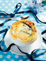 | 1.鑊內燒熱牛油,加紅洋?及砵酒,炒熟紅洋?,加牛肉湯及些利酒煮滾,加百里香,倒湯入碗內。 |
