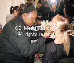 | 負責妝容設計的著名化妝師Pat McGrath,正為女模掃上奪目的桃紅唇色。 |