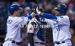 | Kansas City Royals' Willie Bloomquist (8) greets Jose Guillen (11) after both men scored on Guillen's second inning home run against the Toronto Blue Jays on Monday, April 27, 2009, at Kauffman Stadium in Kansas City, Missouri.