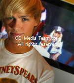 2009年5月5日,奧蘭多,凱爾金坐在屏幕前,上面正演著他在布蘭妮.斯皮爾斯最近一次演唱會上跳舞。 |