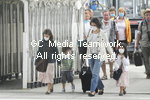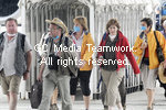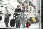 | ?Christophe Morin /IP3 ; Paris, France le 05 mai 2009. Mise en place du dispositif specifique d accueil appellee zone reservee, a l aeroport de Roissy pour accueillir les avions en provenance du Mexique. Les passagers de ces vols, qui ne se melent pas aux autres, ont un aerogare separe avec des prises en charge medicales si necessaire pour faire au virus de la grippe porcine, virus A (H1N1). Arrivee des touristes d un avion, se protegeant avec un masquePassengers wearing protective masks, arriv |