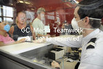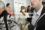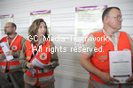 | Paris, France le 05 mai 2009. Des equipes de la croix rougeprennent parti de la mise en place du dispositif specifique d accueil appellee zone reservee, a l aeroport de Roissy pour accueillir les avions en provenance du Mexique. Les passagers de ces vols, qui ne se melent pas aux autres, ont un aerogare separe avec des prises en charge medicales si necessaire pour faire au virus de la grippe porcine, virus A (H1N1)Members of the Red Cross distribute documents about the swine flu to passengers |