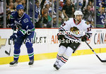 | 02 May 2009: defenseman Willie Mitchell "A" (#8) of the Canucks and forward Adam Burish (#37) of the Blackhawks during a Conference semi-final playoff game between the Vancouver Canucks and the Chicago Blackhawks at General Motors Place in Vancouver, British Columbia, Canada. Finals Score: Vancouver 3 Chicago 6. The Series is now tied 1-1