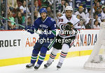 | 02 May 2009: defenseman Kevin Bieksa (#3) of the Canucks clears the puck with a hard charging forward Dustin Byfuglien (#33) of the Blackhawks in pursuit during a Conference semi-final playoff game between the Vancouver Canucks and the Chicago Blackhawks at General Motors Place in Vancouver, British Columbia, Canada. Finals Score: Vancouver 3 Chicago 6. The Series is now tied 1-1