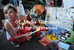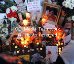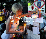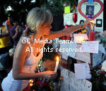 | "Victoria Bedrosian of Argentina lights a candle at a makeshift memorial remembering pop star Michael Jackson at the Jackson family home in Encino, California on June 27, 2009. . " |