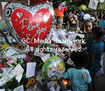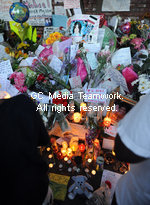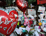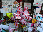 | "A makeshift memorial grows outside the Jackson family home in Encino, California on June 27, 2009. Michael Jackson, the child star turned King of Pop who set the world dancing but whose musical genius was overshadowed by a bizarre lifestyle and sex scandals, died on Thursday. He was 50. " |