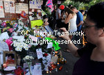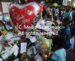 | "Fans view a makeshift memorial outside the Jackson family home in Encino, California on June 27, 2009. Michael Jackson, the child star turned King of Pop who set the world dancing but whose musical genius was overshadowed by a bizarre lifestyle and sex scandals, died on Thursday. He was 50. " |