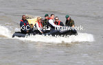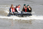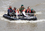 | British actress Sienna Miller and American actor Channing Tatum arrive in a speedboat for the press junket for "G.I. Joe: The Rise Of Cobra" at HMS Belfast, South Bank in London on July 22, 2009. |