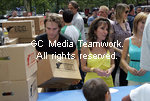 2009年8月6日,紐約北區中心社區,「當世界打開」中的凡.漢尼斯和「我所有的孩子」中的蘇珊.盧奇,為兒童整理食物、書包和學習用品。 |