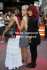 | (L-R) Lil Rounds, Megan Joy and Allison Iraheta, three of the top 10 American Idol finalists take part in the closing bell ceremonies at the NASDAQ in New York on August 10, 2009. |
