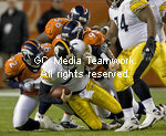 | Denver Broncos Elvis Dumervil (92) and Darrell Reid (95) sack Pittsburgh Steelers quarterback Ben Roethlisberger during the first quarter at Invesco Field at Mile High in Denver on November 9, 2009. |