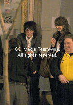 | FILE PHOTO - Ron Wood and Ekaterina Ivanova have fun with a police officer on smoke break at the 2009 Rock and Roll Hall of Fame Induction in Cleveland, April 4, 2009. Rolling Stones guitarist Ron Wood was arrested last night in London -- on suspicion of assaulting his girlfriend, 21-year-old Ekaterina Ivanova . According to the BBC, Wood was busted "on suspicion of assault in connection with a domestic incident" and was released on bail. |