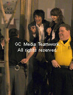 | FILE PHOTO - Ron Wood and Ekaterina Ivanova have fun with a police officer on smoke break at the 2009 Rock and Roll Hall of Fame Induction in Cleveland, April 4, 2009. Rolling Stones guitarist Ron Wood was arrested last night in London -- on suspicion of assaulting his girlfriend, 21-year-old Ekaterina Ivanova . According to the BBC, Wood was busted "on suspicion of assault in connection with a domestic incident" and was released on bail. |