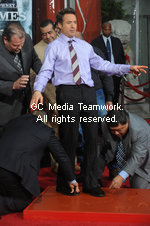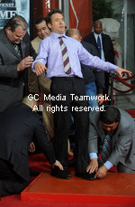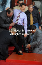 | Actor Robert Downey Jr. tries to maintain his balance as he places his feet in wet cement in the forecourt of Grauman's Chinese Theatre in Los Angeles on December 7, 2009. |