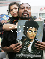 | Jorge Flores and his son Aaron, 8, join the hundreds of people who gather in Harlem to watch the Michael Jackson memorial service on a giant television screen on July 7, 2009 in New York City. The nationally broadcast memorial service is being held in Los Angeles two weeks after the pop singer died. |