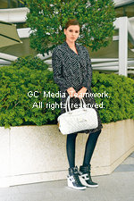 | 黑白色鱼骨纹羊毛混纺织纤维孖襟外套($16,600)、拼色Wedge Sneakers($5,100)、饰以H字样图案的白色软羊皮Duffle Bag($6,800)。 |