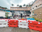 ■鲤鱼门叁家村已提早摆放大型水马。(政府跨部门会议应对 多店贴窗胶纸售罄 「风王」樺加沙扑港 全城戒备掀抢购潮) |