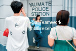 ■游客在「油麻地警署」招牌前摆出各样姿势留影。(黄金周旅客创意手势打卡回味经典 港產片取景胜地油麻地警署人气爆錶) |