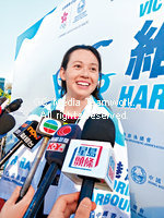 | ■何诗蓓赛后面对记者时笑容满面。(笑言与泳池分别大 「游来游去都未到终点」 飞鱼渡维港何诗蓓首参赛夺亚) |